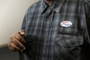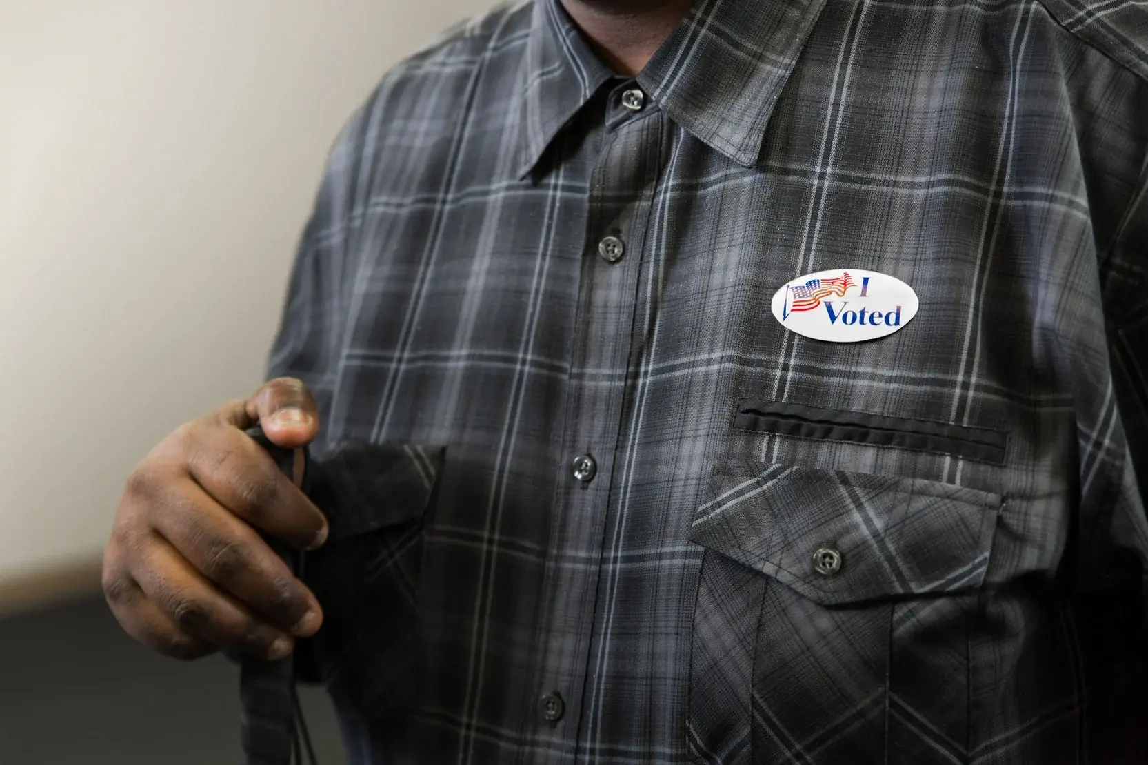 Plaid shirt with I Voted sticker
